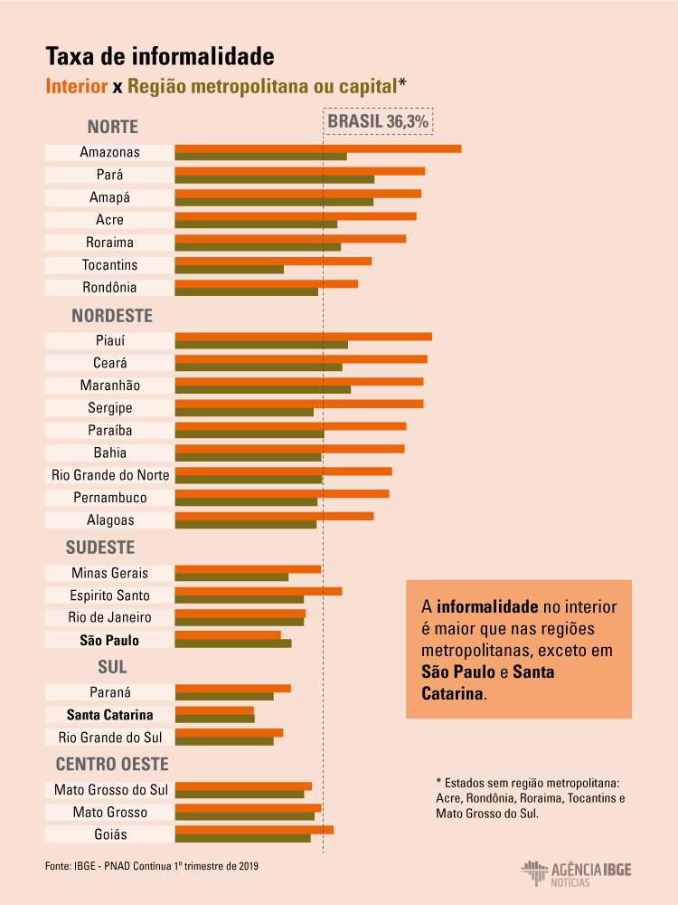 A informalidade no interior é maior que nas regiões metropolitanas, mas isso só não acontece nos estados de São Paulo e Santa Catarina. Quanto à proporção dessa população, o país tem 13 estados com pelo menos metade de seus trabalhadores do interior em condições informais. Todos esses locais estão no Norte e Nordeste, sendo que o interior do Amazonas tem o maior percentual, com 71,7% de informais. Já o interior de Santa Catarina tem a menor taxa, com 19,4% de seus ocupados na informalidade.