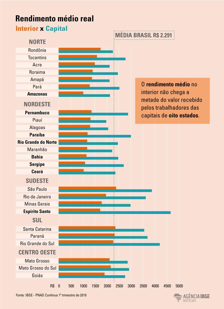 Além da desocupação e da informalidade no interior, os microdados da PNAD Contínua mostram o rendimento médio desses locais no primeiro trimestre do ano. De acordo com a pesquisa, o rendimento mensal dos ocupados no interior equivale a menos da metade do recebido pelos trabalhadores das capitais de oito estados. A média do país é de R$ 2.291.