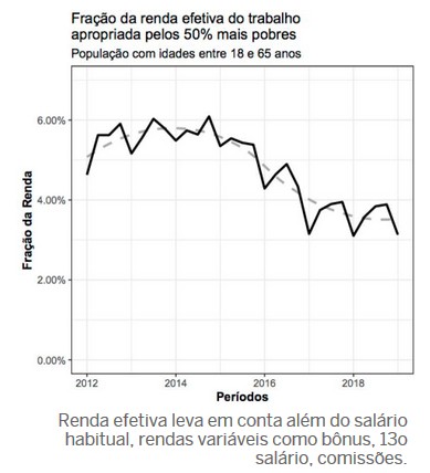 (…) Analisando a série dessazonalizada (quando se exclui os efeitos das variações típicas de cada período do ano), é possível observar que, em meados de 2014, os 50% mais pobres se apropriavam de 5,74% de toda renda efetiva do trabalho. No primeiro trimestre de 2019, a fração cai para 3,5%. Para esse grupo que controla uma quantia pequena do montante existente, essa redução de apenas 2.24 pontos percentuais representa, em termos relativos, uma queda de quase 40%.