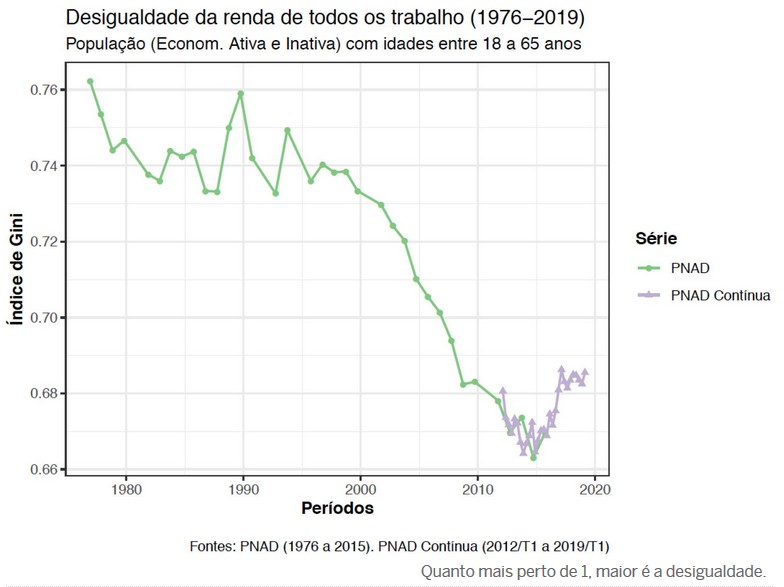 A desigualdade no mercado de trabalho aumentou pelo 17º trimestre consecutivo e alcançou, no primeiro trimestre de 2019, seu maior nível em pelo menos sete anos, de acordo com estudo do Instituto Brasileiro de Economia da Fundação Getulio Vargas (FGV IBRE). O índice de Gini, que mede a renda do trabalho per capita, alcançou 0,627, o maior patamar da série histórica iniciada em 2012. Quanto mais perto de 1, maior é a desigualdade. De acordo com o pesquisador da área de Economia Aplicada do FGV IBRE, Daniel Duque, a desigualdade da renda subiu quando se observa a renda individual do trabalhador e também a renda por domicílios.