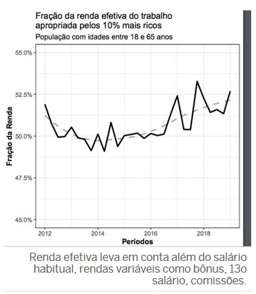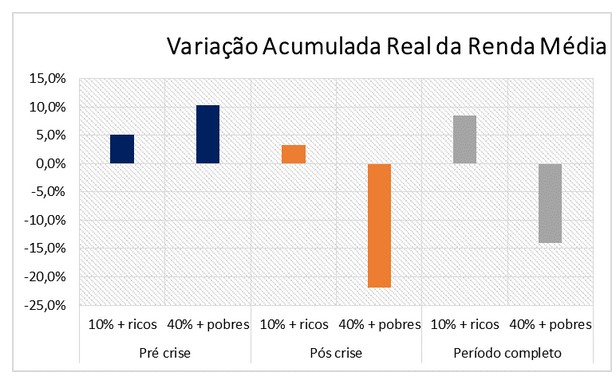 As oscilações na relação entre a renda média dos 10% mais ricos e dos 40% mais pobres indicam que desde novembro de 2015 essa desigualdade vem subindo. De acordo com o levantamento, a variação acumulada real da renda média entre os mais ricos (10% da população) e os mais pobres (40% da população) mostra que, no período pré-crise (até 2015), os mais ricos tiveram aumento real de 5% e os mais pobres, o dobro, 10%. Depois do pós-crise, a renda acumulada real dos mais ricos aumentou 3,3% e a dos mais pobres caiu mais de 20%. Observando-se toda a série histórica, desde 2012, a renda real acumulada dos mais ricos aumentou 8,5% e a dos mais pobres caiu 14%.