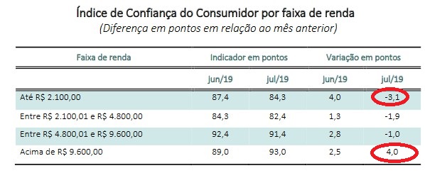 A queda da confiança em julho ocorreu em todas as classes de renda, exceto para os consumidores com renda familiar mensal superior a R$ 9.600. A confiança dos consumidores de maior poder aquisitivo subiu 4,0 pontos atingindo 93,0 pontos, influenciado pelo aumento do otimismo com a situação econômica futura e maior ímpeto para compras de bens duráveis que chega a nível próximo a 100 pontos. Em contrapartida, as famílias com menor poder aquisitivo (até R$ 4.800) são as com menor nível de confiança e menos otimistas com o futuro.