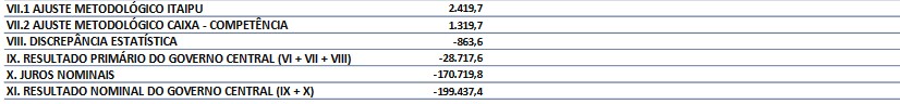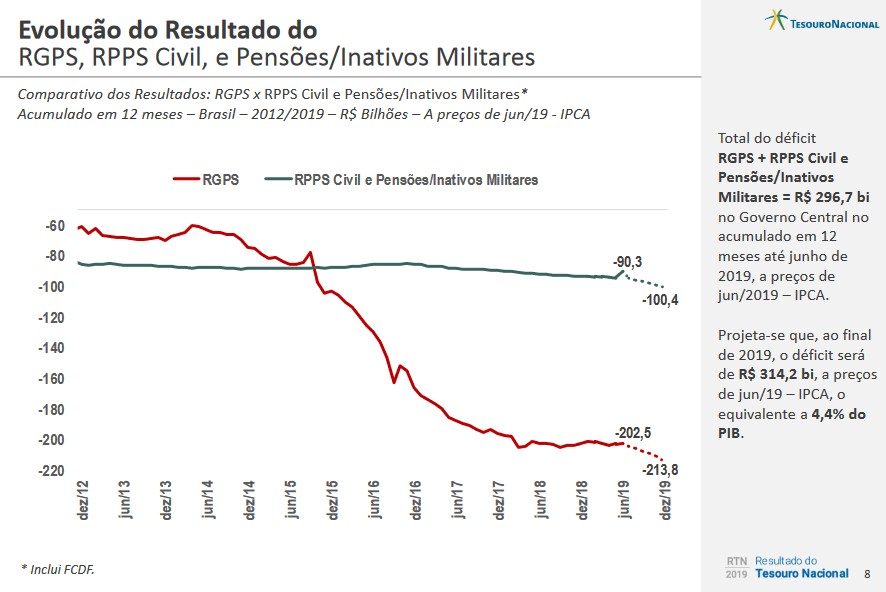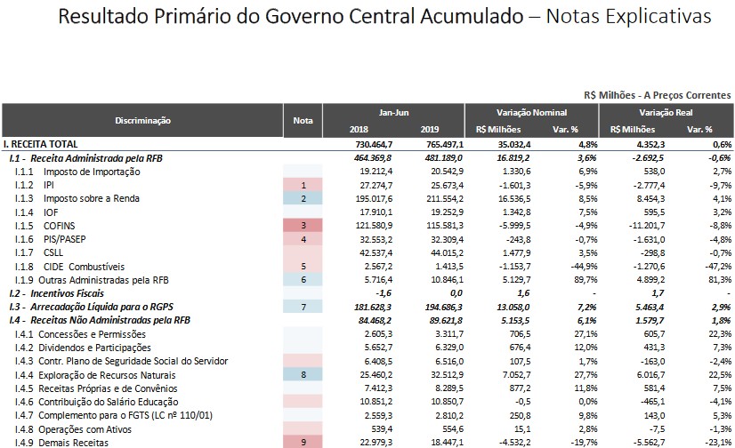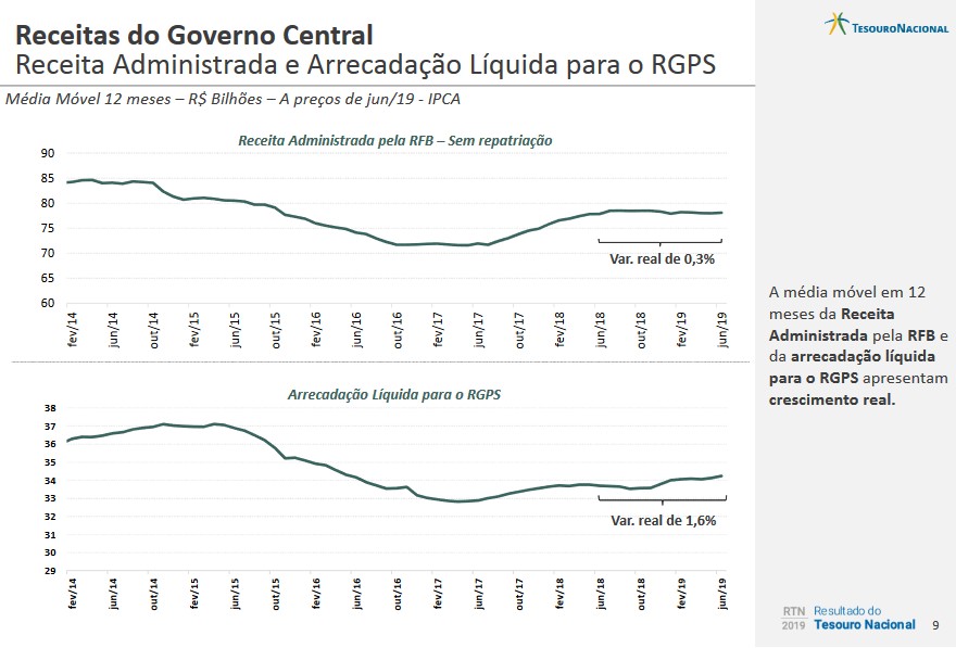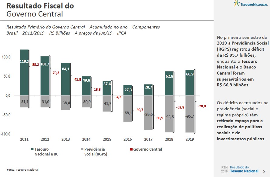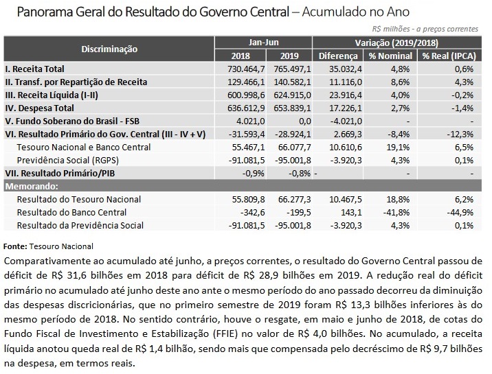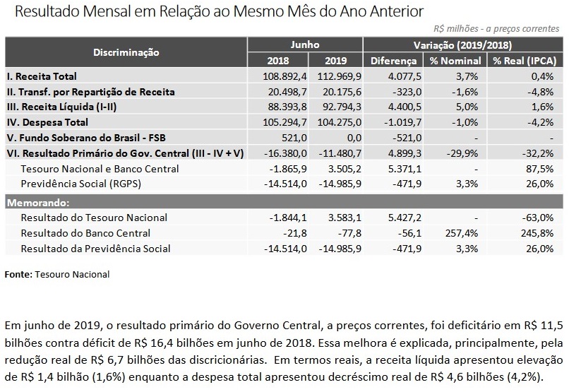 Em junho de 2019, o resultado primário do Governo Central foi um déficit de R$ 11,5 bilhões, frente ao déficit de R$ 16,5 bilhões observado no mesmo mês do ano anterior (em termos nominais). O Tesouro Nacional e o Banco Central foram superavitários em R$ 3,5 bilhões, enquanto a Previdência Social (RGPS) apresentou déficit de R$ 15,0 bilhões.