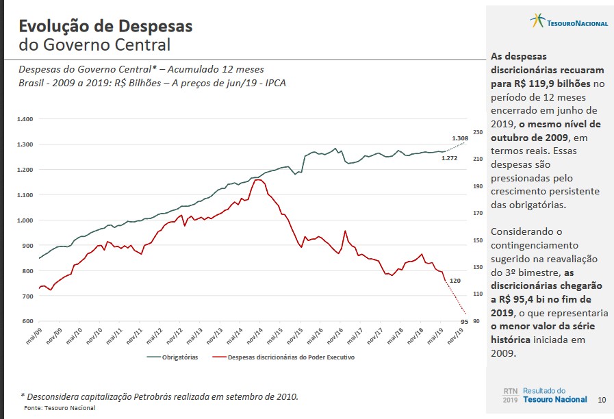 Resultado do Tesouro Nacional – Junho de 2019 – Publicado em 26 de julho de 2019 na LOA. Com isso, em 2019, a proporção de despesas discricionárias em relação às despesas primárias deverá alcançar 6,8% (R$ 95,4 bilhões), bem abaixo do percentual de 9,5% verificado em 2018. Em valores corrigidos pelo IPCA, um gasto anual de R$ 95,4 bilhões em discricionárias representaria a mínima histórica da série iniciada em 2009.
