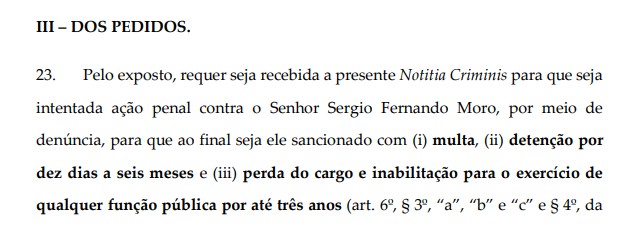 Trecho de notícia-crime (íntegra aqui) protocolada pela cúpula do PT, junto à Procuradoria Geral da República, pedindo investigação e eventual prisão do ministro da Justiça, Sergio Moro.
