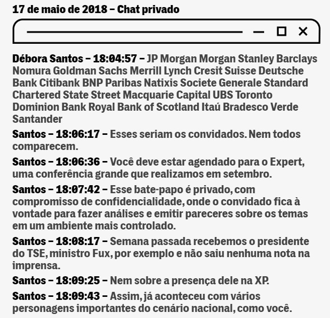 (…) Débora Santos, que se apresenta como “consultora/ analista de política e Judiciário” da empresa. No começo da conversa, ela diz que é esposa de Eduardo Pelella, que era o chefe de gabinete e braço direito de Rodrigo Janot quando Procurador-Geral da República. Antes de trabalhar na XP, Santos era assessora particular do Ministro Edson Fachin, relator da Lava Jato no STF.
