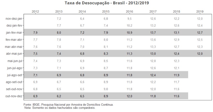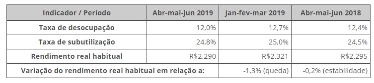 No trimestre encerrado em junho de 2019, a taxa de desocupação (12,0%) recuou 0,7 pontos percentuais (p.p.) em relação ao trimestre de janeiro a março de 2019 (12,7%) e caiu 0,4 p.p. na comparação com o mesmo trimestre de 2018 (12,4%).
