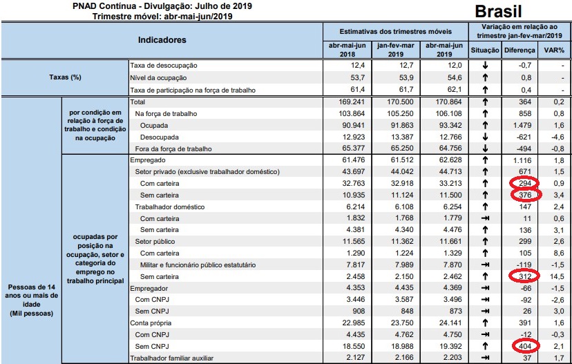 O número de empregados no setor privado com carteira assinada (exclusive trabalhadores domésticos) foi de 33,2 milhões de pessoas, subindo em ambas as comparações: 0,9% (mais 294 mil pessoas) frente ao trimestre anterior e 1,4% (mais 450 mil pessoas) frente ao mesmo período de 2018. Mas o número de empregados sem carteira assinada (11,5 milhões de pessoas) também subiu em ambas as comparações: 3,4% (mais 376 mil pessoas) frente ao trimestre anterior e 5,2% (mais 565 mil pessoas) em relação ao mesmo trimestre de 2018.