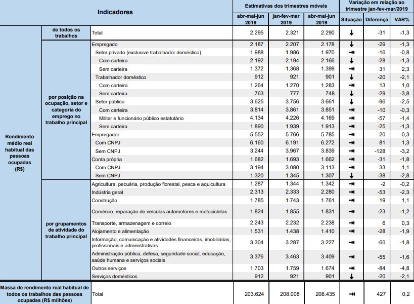 A massa de rendimento real habitualmente recebido em todos os trabalhos pelas pessoas ocupadas foi estimada, para o trimestre móvel de abril a junho de 2019, em R$ 208,4 bilhões de reais. Houve estabilidade em relação ao trimestre anterior e alta de 2,4% frente ao mesmo trimestre de 2018, o que representa um acréscimo de R$ 4,8 bilhões na massa de rendimentos.