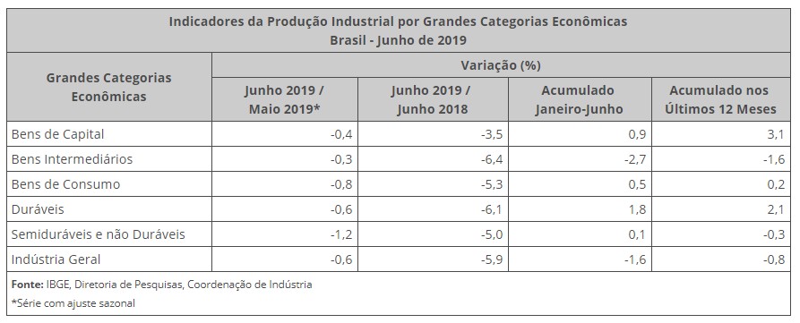 Na comparação com junho de 2018, a queda da indústria foi mais acentuada, de 5,9%, acumulando -1,6% no primeiro semestre do ano. Além da redução de ritmo, o efeito calendário contribuiu negativamente, já que junho de 2019 teve dois dias úteis a menos que junho do ano passado.