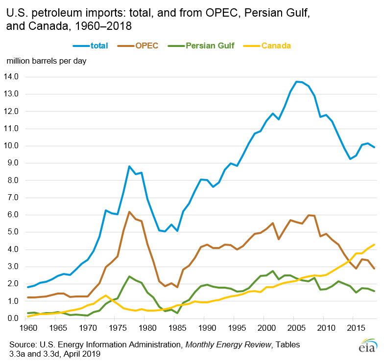 Observe com atenção esse gráfico abaixo. Ele mostra a queda brutal da participação dos países da OPEC (Organização dos Países Produtores de Petróleo) na importação americana. O Canadá, tranquilo e estável vizinho do norte dos EUA, tornou-se o principal fornecedor de petróleo ao país.