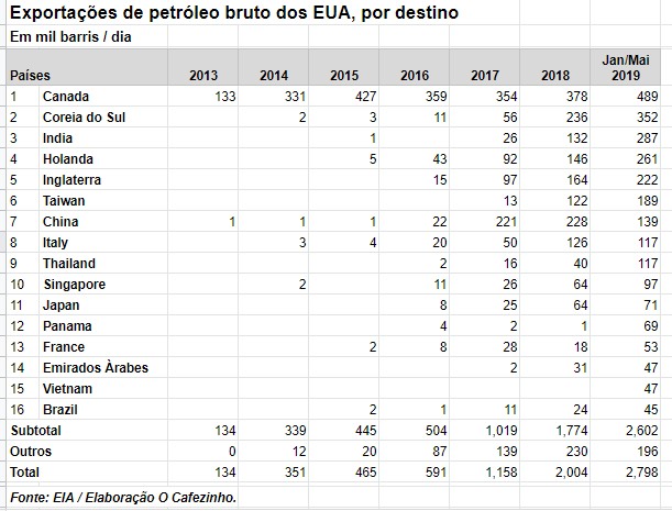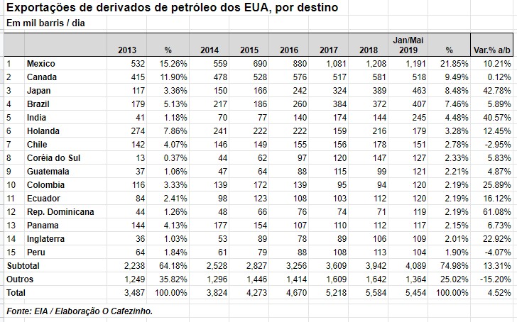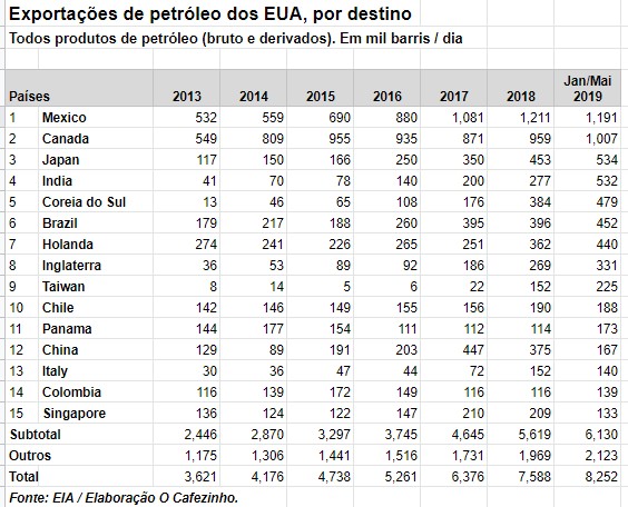 Considerando todos os produtos, incluindo o óleo bruto, os principais destinos do petróleo americano são, por ordem de grandeza: México, Canadá, Japão, Índia, Coréia do Sul e Brasil