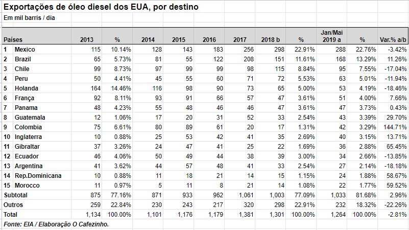 Se olharmos apenas para o óleo diesel americano, o Brasil já é o segundo maior destino, importando mais de 13% de todo o diesel exportado pelos EUA no cinco primeiros meses do ano.