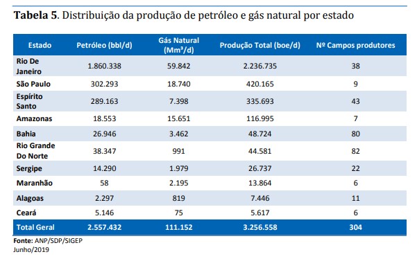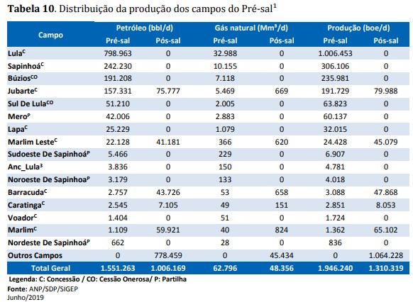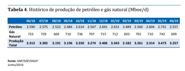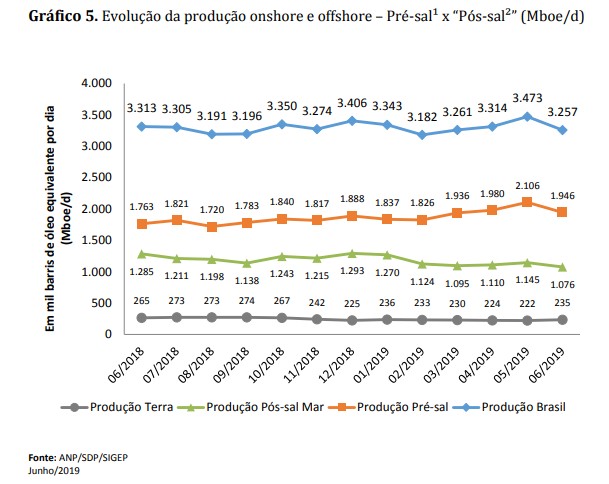 A produção de petróleo e gás natural em junho de 2019 totalizou em torno de 3,257 milhões de barris de óleo equivalente por dia (boe/d), sendo 59,8% da produção (1,946 milhões de boe/dia) oriundos de campos do Pré-sal.