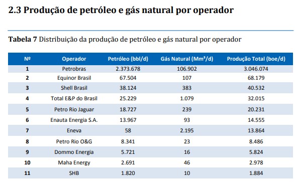 Os campos marítimos produziram 96,1% do petróleo e 80,8% do gás natural. Os campos operados pela Petrobras produziram 93,5% do petróleo e do gás natural. A produção nacional ocorreu em 7.103 poços, sendo 645 marítimos e 6.458 terrestres.