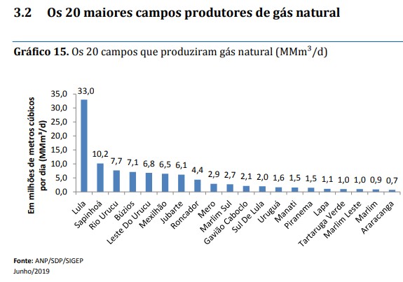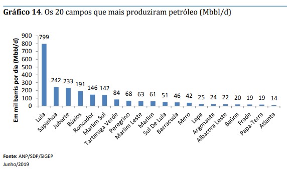Lula, na Bacia de Santos, foi o que mais produziu petróleo, uma média de 799 mil de bbl/d. Também foi o maior produtor de gás natural: média de 33 milhões de m³/dia.