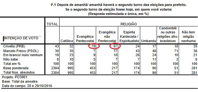 Os números que mais chamam a atenção é o eleitorado evangélico. Entre pentecostais e não pentecostais, um total de 67% a 78% votaram em Crivella.