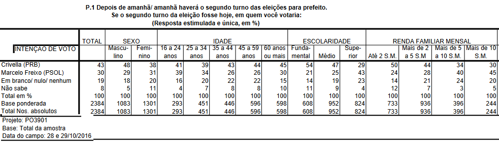 Uma pesquisa Datafolha feita às vésperas da votação no segundo turno, e que chegou razoavelmente perto da realidade (coisa rara no Rio, um lugar onde as pesquisas costumam errar por margens assombrosas), nos fornece um perfil sócio-econômico do eleitores de Crivella e Freixo.