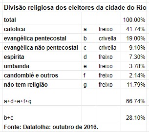 Os eleitores não-evangélicos totalizam, segundo o Datafolha de 2016, 67% do eleitorado carioca.