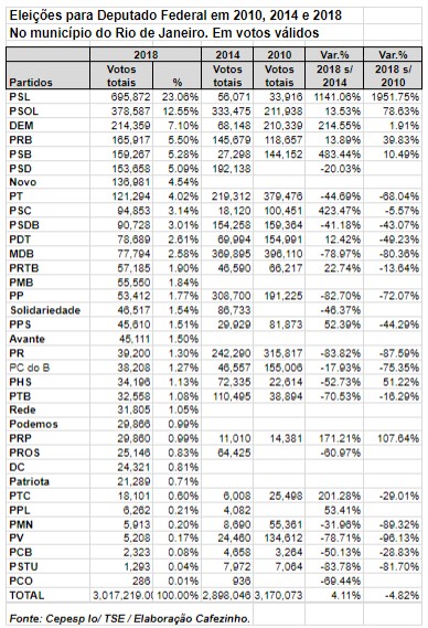 O quadro acima, com o desempenho dos partidos para o legislativo federal fluminense (mas compilando apenas os votos na capital), mostra, em primeiro lugar, o crescimento espetacular do PSL, puxado pelo voto em Bolsonaro, mas também do DEM, ajudado pelo bom desempenho de Rodrigo Maia e Pedro Paulo, que ficaram entre os 10 deputados mais votados da capital.