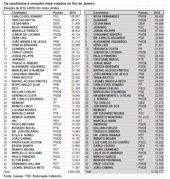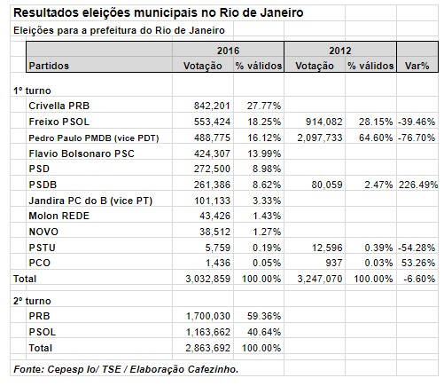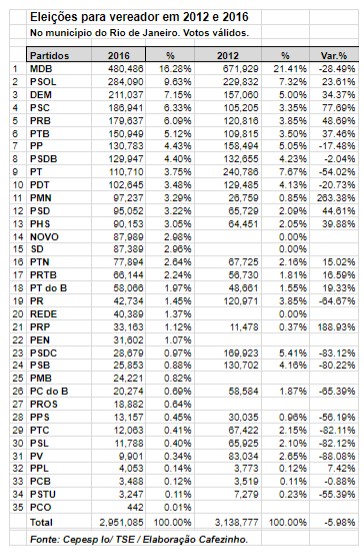 Fizemos também o comparativo com a votação para a Câmara de Vereadores do Rio, por partido, nas duas últimas eleições municipais (2012 e 2016).
