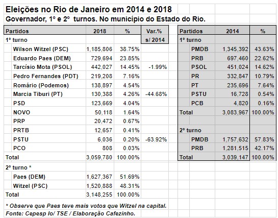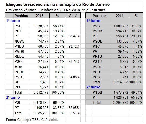 Por fim, analisemos os números da eleição presidencial no município do Rio de Janeiro em 2018 e 2014.