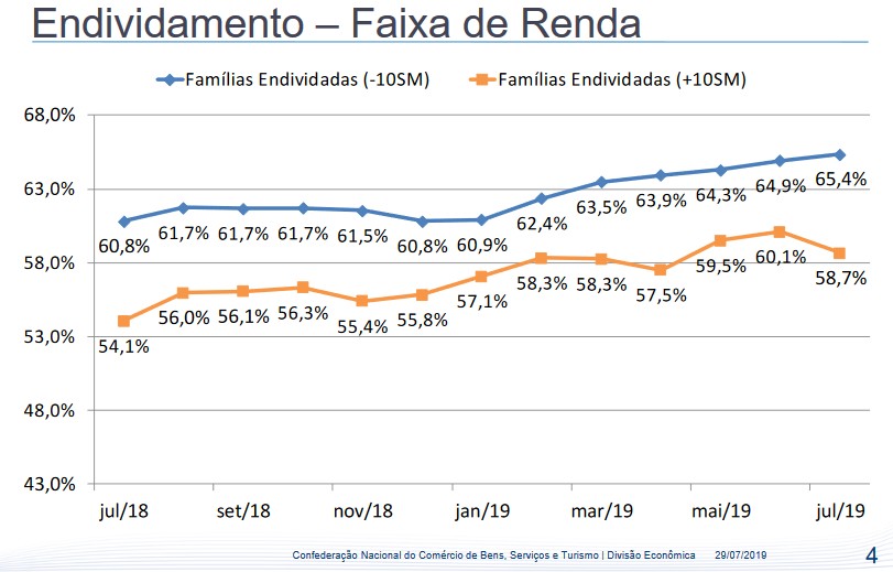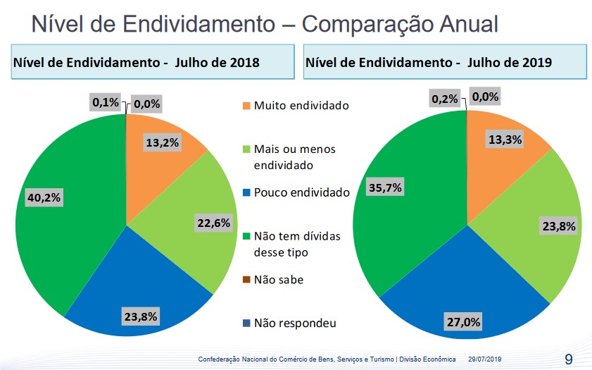 O percentual de famílias com dívidas apresentou, em julho de 2019,a sétima alta mensal consecutiva, alcançando 64,1% do total, o maior patamar desde julho de 2013. Em comparação com o mesmo período do ano passado,também houve alta.