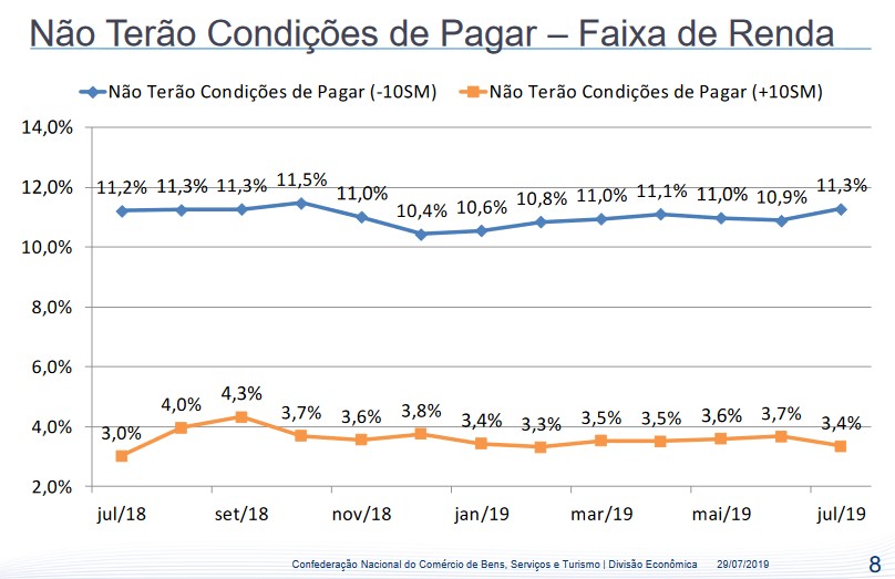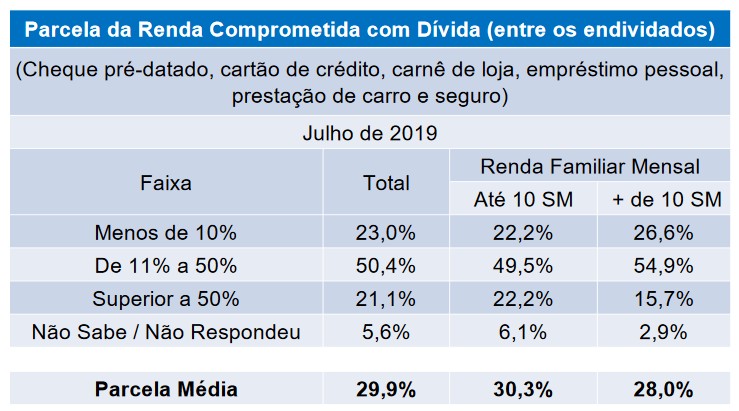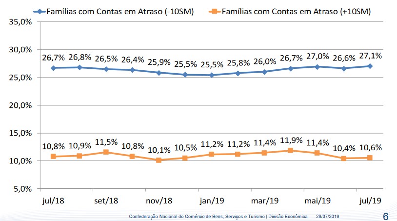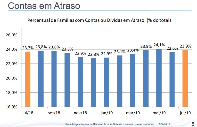 O percentual de famílias com contas ou dívidas em atraso também aumentou entre os meses de junho e julho de 2019, bem como em relação a julho do ano anterior, para 23,9%. O percentual que relatou não ter condições de pagar suas contas em atraso apresentou a mesma tendência de alta, tanto na comparação mensal quanto na anual, totalizando 9,6% em julho de 2019.
