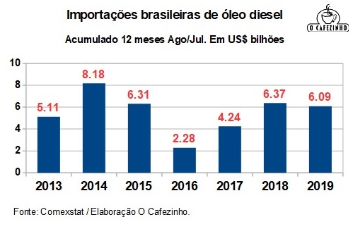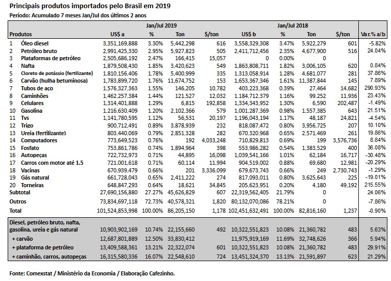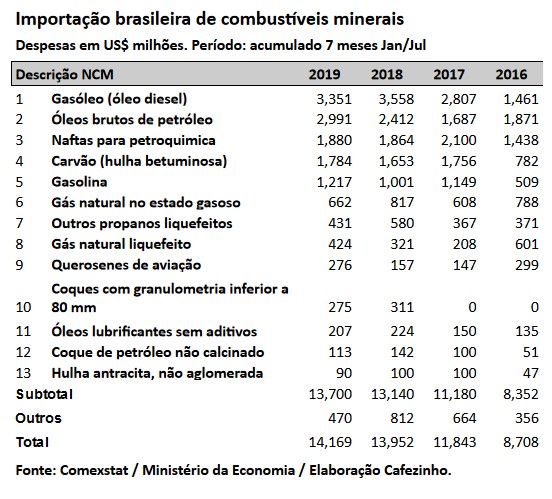 É interessante observar, aliás, que os quatros produtos mais importados pelo Brasil, nos sete primeiros meses de 2019, são ligados diretamente à indústria petrolífera; por ordem de grandeza, foram: óleo diesel, petróleo bruto, plataformas de petróleo, e nafta. Um pouco mais adiante, na décima posição, encontramos a gasolina.