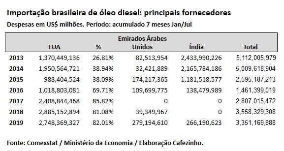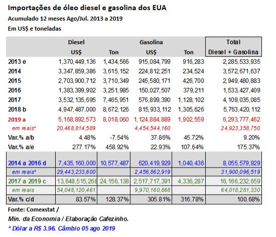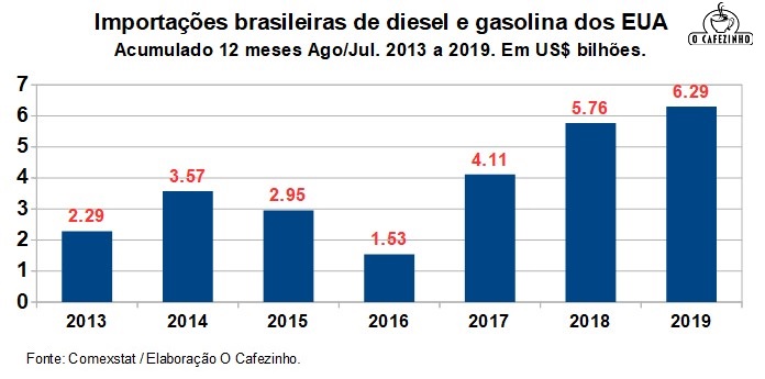No acumulado dos últimos 36 meses, até julho de 2019, o Brasil gastou, apenas com a importação de óleo diesel e gasolina fornecidos pelos Estados Unidos, um total de US$ 16,2 bilhões, o que corresponderia, no câmbio de hoje, a R$ 64,0 bilhões.