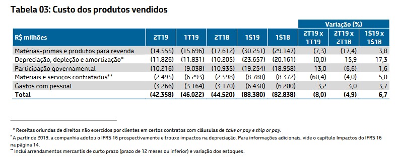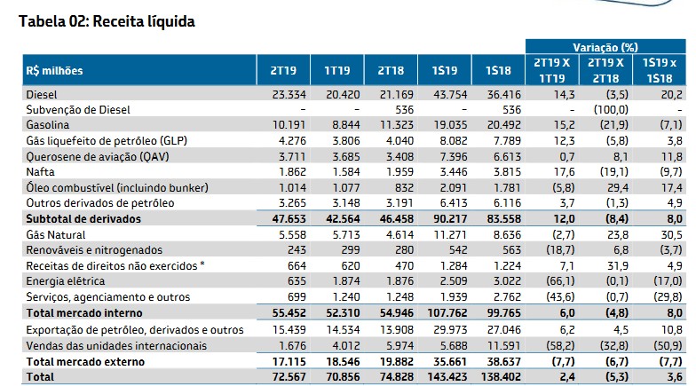 No segundo trimestre de 2019, a receita de vendas total da Petrobras foi de R$ 72,56 bilhões; desse total, 65%, ou R$ 47,65 bilhões vieram da venda de derivados.