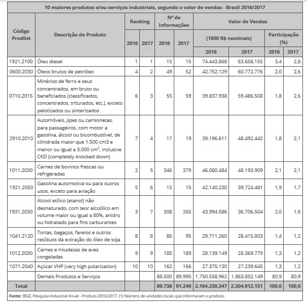 Segundo o IBGE, a indústria de diesel é a mais importante do país; as vendas de diesel geraram quase R$ 140 bilhões no acumulado de 2016 e 2017. A indústria de venda do petróleo bruto ficou em segundo lugar, gerando R$ 103 bilhões em dois anos.