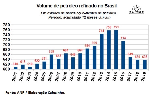 Infelizmente, a Petrobras não está investindo muito em sua indústria de refino, como se pode ver pelos números atualizados da Agência Nacional de Petróleo (ANP), que mostram um declínio acentuado do volume processado em nossas refinarias.