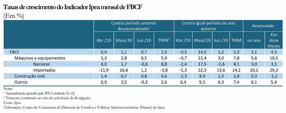 O Indicador Ipea Mensal de Formação Bruta de Capital Fixo (FBCF), divulgado pelo Instituto de Pesquisa Econômica Aplicada (Ipea) nesta terça-feira, 06, apontou alta de 0,7% em junho em relação a maio de 2019, na série com ajuste sazonal. O resultado mostrou avanço pelo quarto mês consecutivo. FBCF são os investimentos em aumento da capacidade produtiva da economia e na reposição da depreciação de seu estoque de capital fixo. O indicador encerrou o segundo trimestre deste ano com crescimento de 2,3% sobre o trimestre anterior. No acumulado em 12 meses, os investimentos registraram expansão de 4,3%.