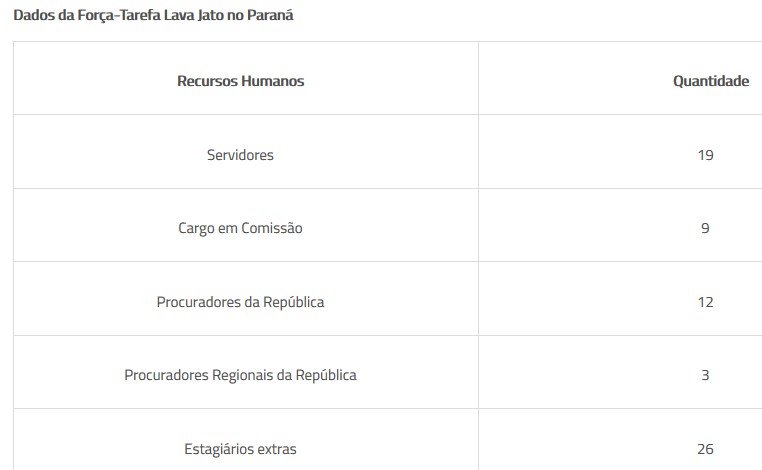 Servidores – Em relação ao quadro de pessoal de apoio, a FT conta, atualmente, com 28 servidores, sendo nove contratados, e 26 estagiários extras. Ao todo, a equipe tem 69 integrantes entre procuradores, servidores, contratados e estagiários. A título de comparação, a quantidade de membros destinada à FT Lava Jato no Paraná supera o quadro do MPF em estados como Roraima, que conta com seis procuradores e 78 servidores entre efetivos e comissionados.