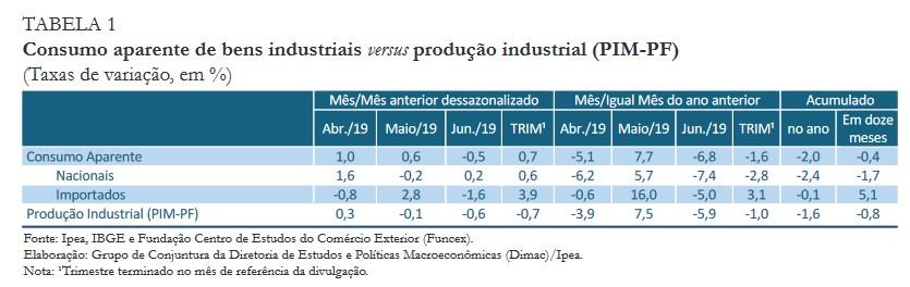 Frente a junho de 2018, o Indicador registrou retração de 6,8% na demanda interna por bens industriais, resultado que ficou aquém do desempenho da produção industrial (recuo de 5,9%), mensurada pela Pesquisa Industrial Mensal de Produção Física (PIM-PF) do Instituto Brasileiro de Geografia e Estatística (IBGE).