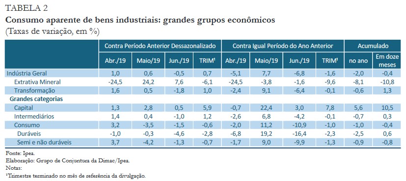 Na análise das grandes categorias econômicas – bens de capital, intermediários e de consumo –, mais uma vez a primeira foi a única com resultado positivo (alta de 0,5%) em junho, na comparação com o mês de maio. O destaque negativo ficou por conta da queda de 4,6% no segmento de bens de consumo duráveis. A categoria de bens de capital também foi a única a observar crescimento na comparação com o ano anterior, ficando 3% acima do verificado em junho de 2018.