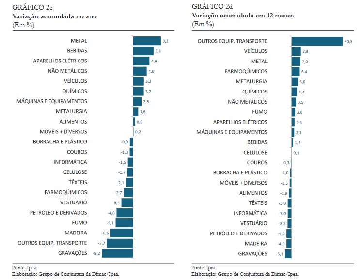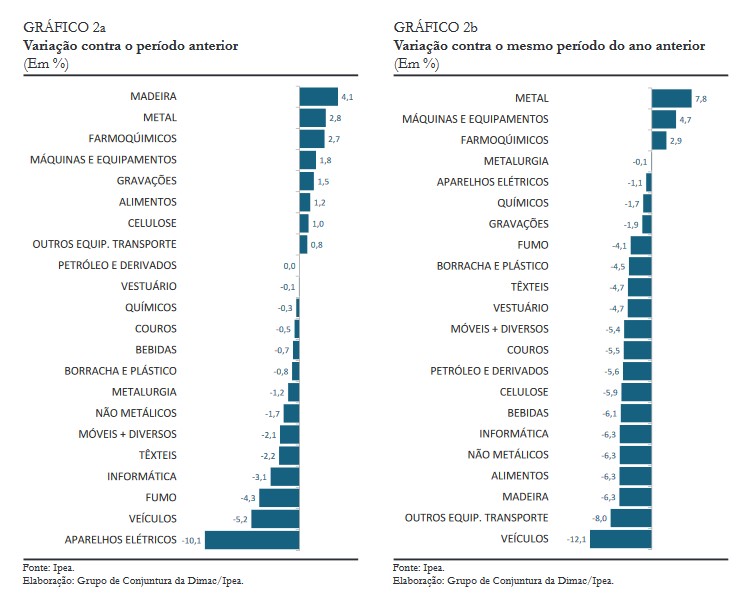 No que diz respeito à classificação setorial, de um total de 22 segmentos, oito tiveram crescimento em relação ao período anterior. Entre aqueles com peso relevante, os segmentos “produtos de metal” e “farmoquímicos” avançaram 2,8% e 2,7%, respectivamente. Na comparação com junho de 2018, apenas três segmentos tiveram alta, com destaque para o segmento “produtos de metal”, que cresceu 7,8%. O segmento “veículos” teve a maior oscilação negativa: queda de 12,1%.