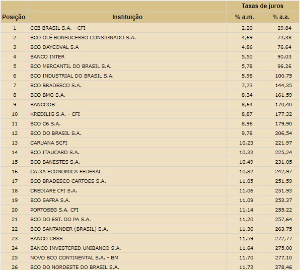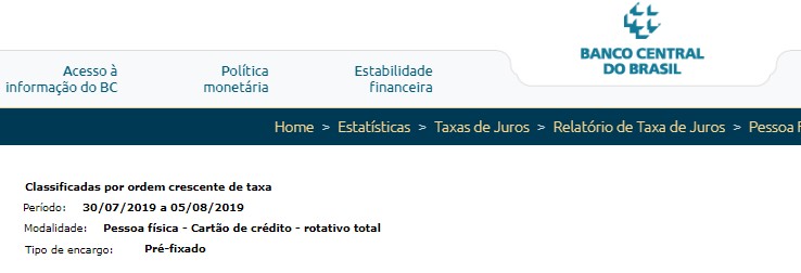 Confira as taxas do cartão de crédito rotativo para a pessoa física, segundo dados do Banco Central: