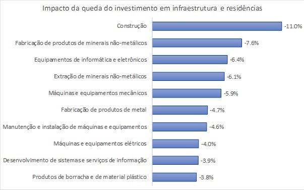Destaca-se que não apenas os produtores de commodities e os setores de construção foram afetados, mas também os fornecedores desses setores e aqueles que dependem do consumo das famílias. Uma vez que a demanda e a renda caíram nos setores diretamente afetados, os fornecedores da cadeia também tiveram sua produção reduzida, o que é mais claro nos setores que fornecem insumos para a construção civil, nos setores produtores de máquinas e equipamentos e nos desenvolvedores de softwares. Além disso, alguns setores, como educação e saúde privada, assim como, os fornecedores de bens de consumo, que dependem da demanda das famílias, tiveram uma queda representativa da produção devido ao desligamento desses motores.