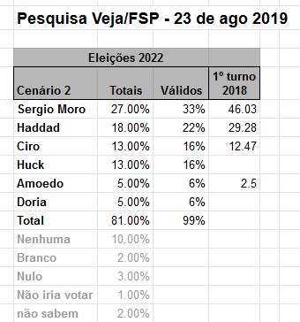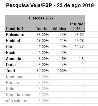 Eu fiz duas tabelas para converter as intenções de voto mostradas na pesquisa para votos válidos, com objetivo de comparar ao resultado no primeiro turno.