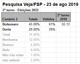 Convertido em votos válidos, portanto, vemos que Bolsonaro e Haddad desidratam um pouco. Bolsonaro obteve 46% dos votos válidos no primeiro turno, e na pesquisa Veja/FSP tem 43% dos válidos. A diferença está quase na margem de erro e, portanto, não é relevante.