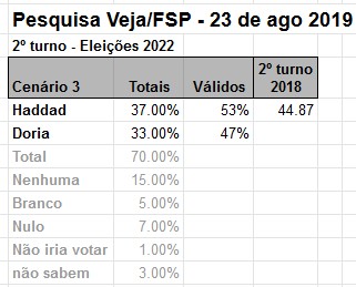Num terceiro cenário apresentado pela Veja/FSB, um segundo turno entre Haddad e Doria, o petista ganharia por 53% X 47%.  A vantagem de 6 pontos do petista sobre Doria não é confortável, porque Haddad foi ao segundo turno de 2018 e, portanto, tem um recall que o tucano não tem.