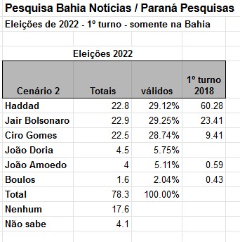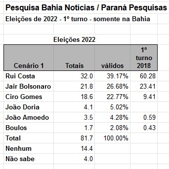 Novamente, eu preparei tabelas com colunas trazendo o resultado eleitoral em 2018, no primeiro turno, no estado da Bahia, e converti os percentuais da pesquisa do Bahia Notícias para votos válidos.