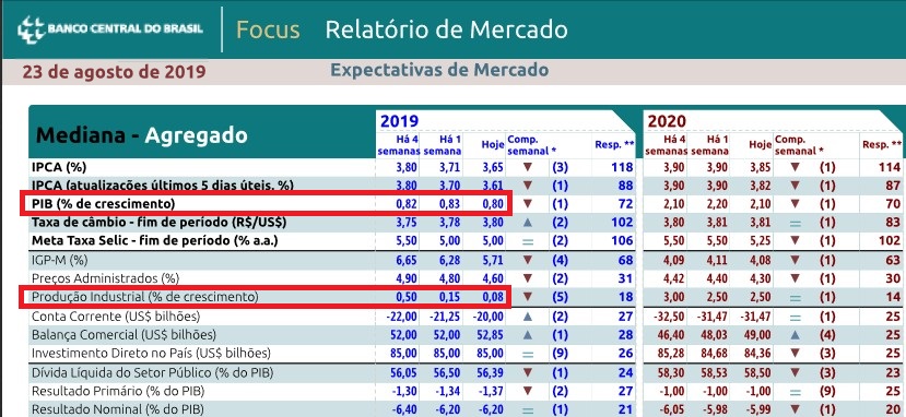 A produção industrial também foi reajustada para baixo. Segundo o Focus, a produção industrial brasileira em 2019, estimada em 0,15% semana passada, passou para 0,08% esta semana.