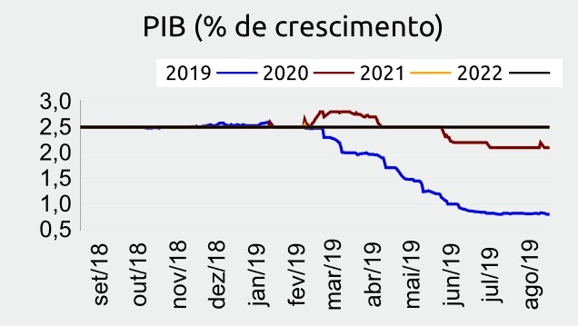A edição de hoje do Boletim Focus, publicação semanal do Banco Central com base em opiniões de agentes econômicos, reduziu a projeção do PIB brasileiro de 2019 para 0,80%. É o menor índice desde que as projeções para o PIB deste ano começaram a ser realizadas –  no início do ano, até fevereiro, estimava-se um crescimento de 2,5%.