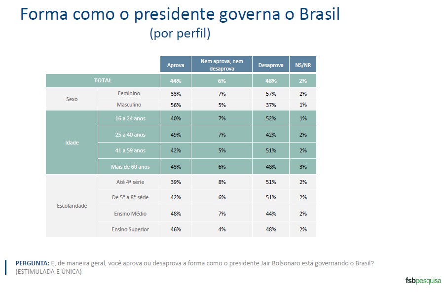 Na pesquisa Veja/FSP, feita entre os dias 16 a 19 de agosto, com duas mil pessoas, por telefone, 44% delas responderam que aprovam a forma como o presidente Bolsonaro governa o Brasil, 6% que não aprovam nem desaprovam, 48% que desaprovam e 2% preferiam não responder.