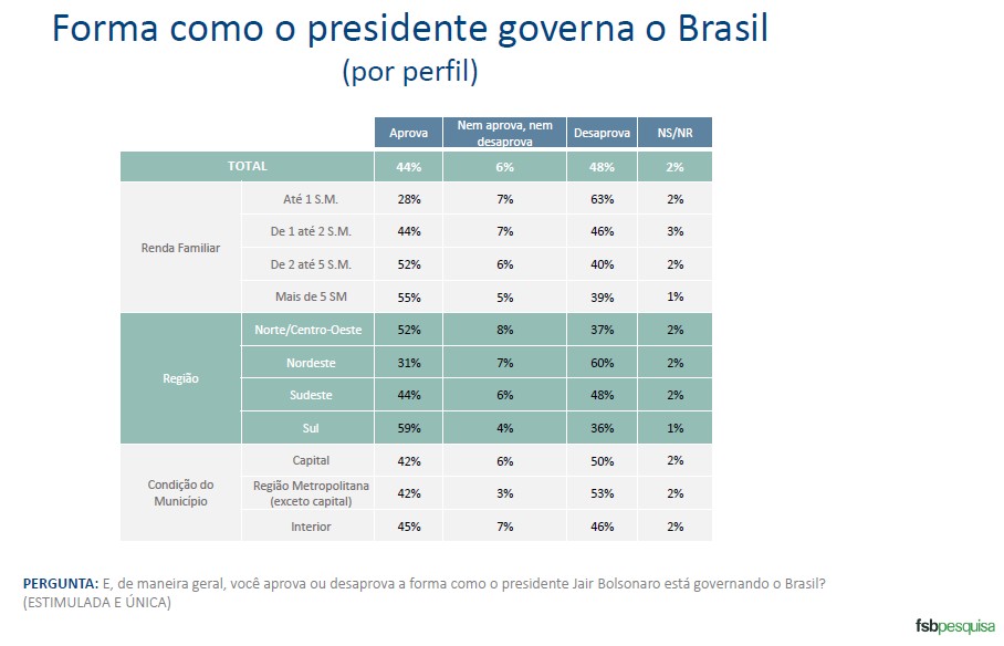 Há diferenças regionais muito agudas: no Sul, 59% aprovam Bolsonaro, contra 36% que o desaprovam; no Nordeste, a situação é invertida, com apenas 31% de apoio e 60% de rejeição.