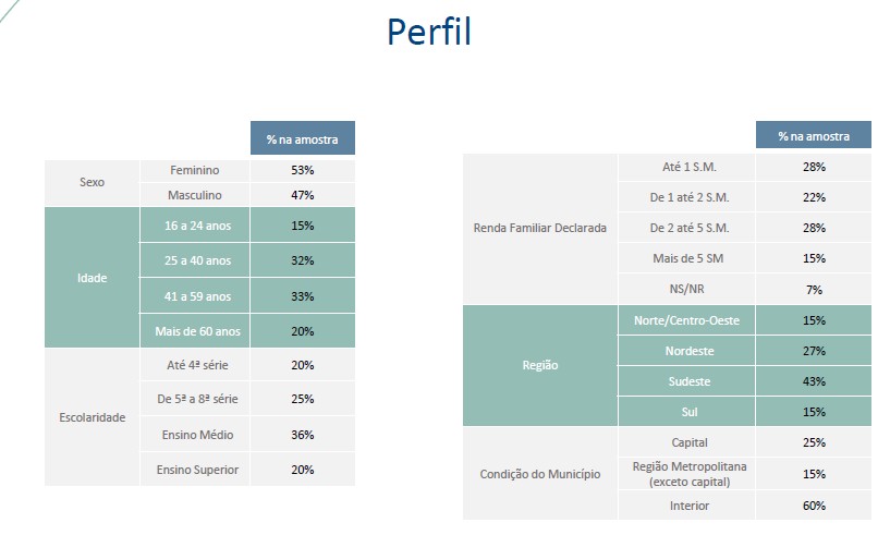 Segundo o perfil dos entrevistados informado ao final da pesquisa, 28% ganham até 1 salário familiar, e 15%, mais de 5 salários.