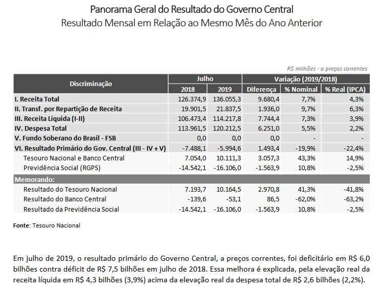 Em julho de 2018, o déficit primário do Governo Central foi maior: R$ 7,488 bilhões. “Essa melhora é explicada, pela elevação real da receita líquida em R$ 4,3 bilhões (3,9%) acima da elevação real da despesa total de R$ 2,6 bilhões (2,2%)”, diz o Tesouro.
